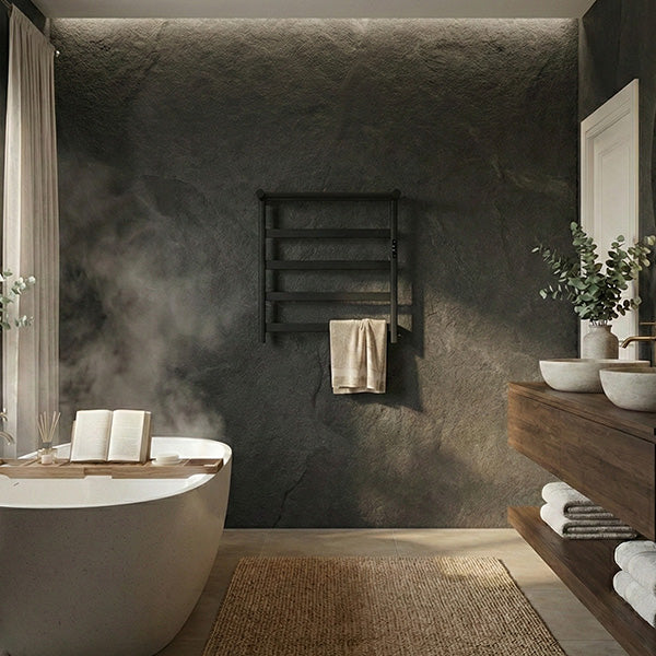 The Auren™ is a wall-mounted heated towel warmer with clean horizontal bars and a discreet heated top shelf. Stainless steel construction with a refined minimal profile. Compact footprint fits modern ensuites and urban bathrooms without sacrificing capacity. Transforms everyday towels into warm comfort—hotel-level performance, residential scale. Hardwired installation. 2-year warranty.