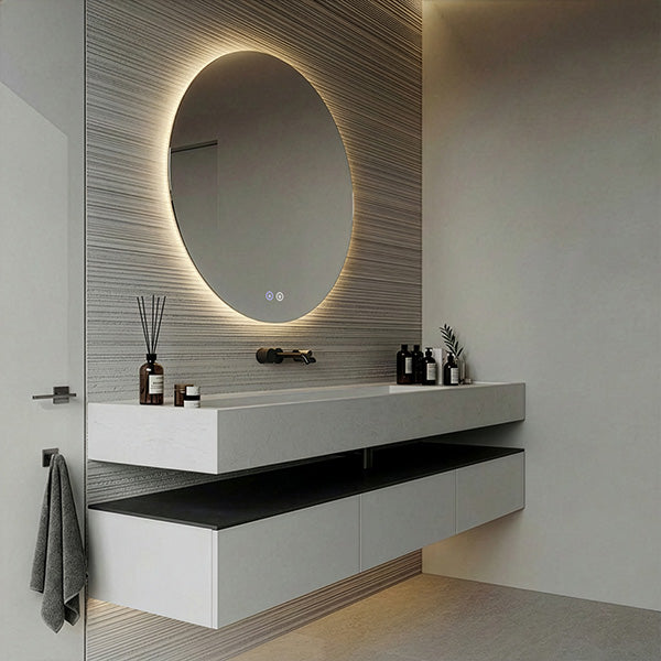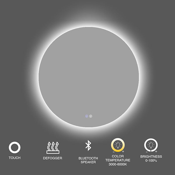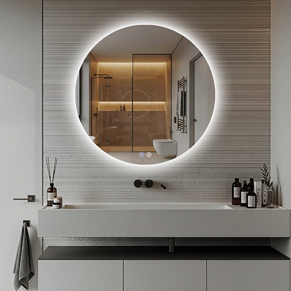 The Halo™ is a frameless round LED mirror designed for modern bathrooms that demand both form and function. Edge-to-edge illumination eliminates shadows, while adjustable color temperature (3000K–6000K) lets you shift from warm ambient light to bright daylight with a single touch. No frame. No visual clutter. Just clean, even light exactly where you need it. Three sizes. Integrated defogger, touch controls, Bluetooth speakers. 5-year warranty.