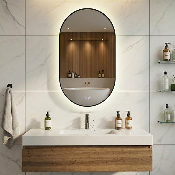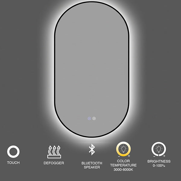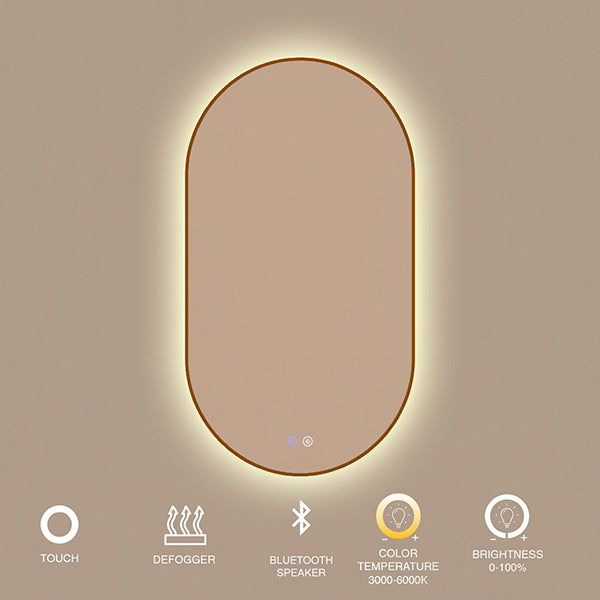 The Lina™ is a framed vertical LED mirror designed for narrow walls, powder rooms, and anywhere square footage is tight. The elongated pod shape maximizes usable mirror surface while minimizing width. Slim aluminum frame in matte black or bronze adds structure. Perimeter LED lighting wraps all four sides for even, shadow-free illumination. Adjustable color temperature (3000K–6000K), touch controls, integrated defogger, and Bluetooth speakers—same functionality as our wider mirrors, just optimized for tight spaces. 5-year warranty.