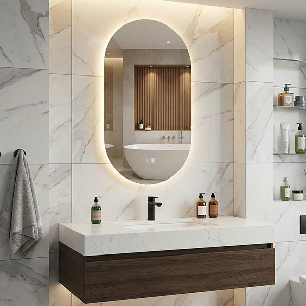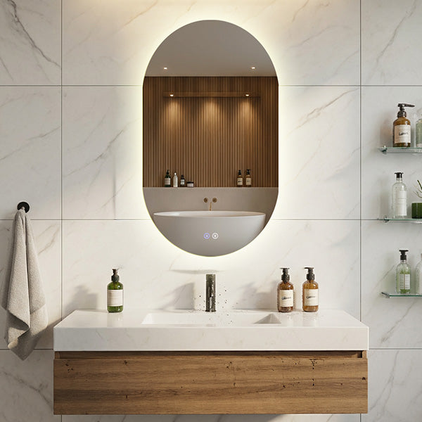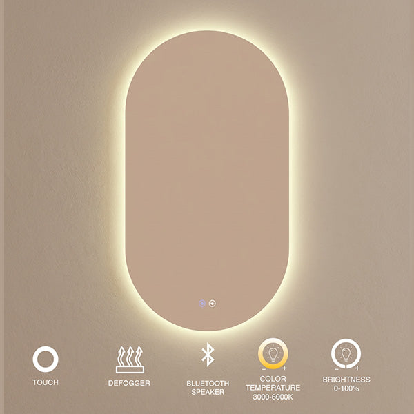 The Vero™ is a frameless vertical LED mirror designed for narrow walls where width is limited. The elongated pod shape—tall and narrow—maximizes usable mirror surface while minimizing horizontal footprint. No frame means no visual clutter, just clean glass with perimeter LED lighting on all four sides. Adjustable color temperature (3000K–6000K), touch controls, integrated defogger, and Bluetooth speakers. Copper-free glass that won't corrode. This is the frameless solution for powder rooms, guest baths, and any space under 30 inches wide.